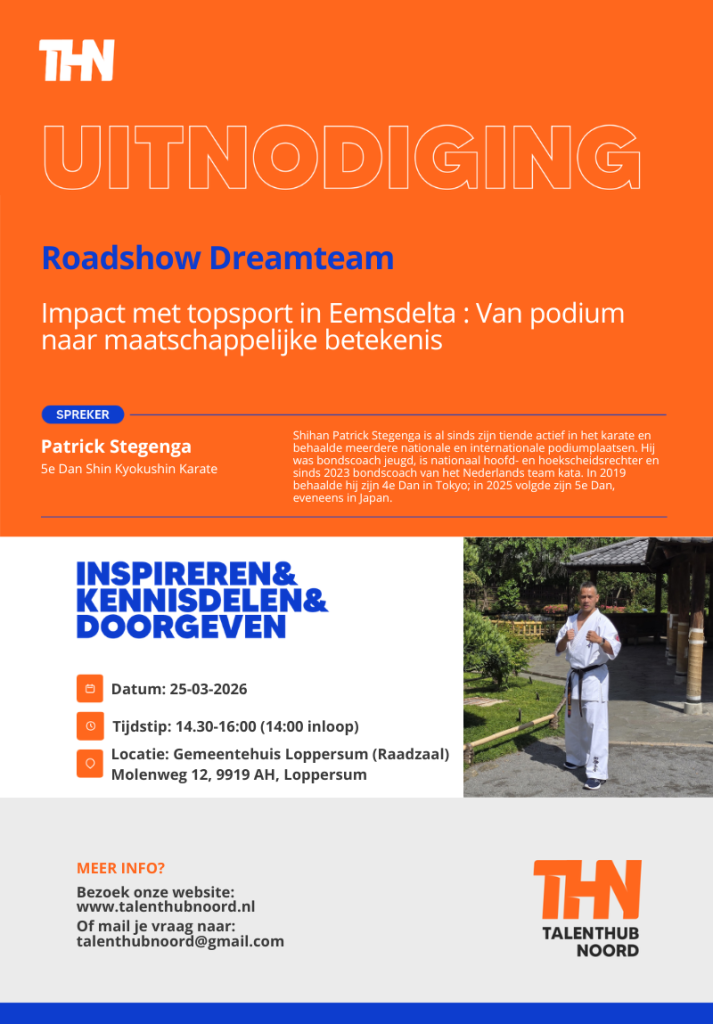 Daarna gaan we in gesprek over maatschappelijke uitdagingen in de regio Eemsdelta en wat dit concreet kan betekenen voor sporters die hun invloed lokaal willen inzetten. We sluiten af met een toelichting op het maatschappelijk Dreamteam-programma, met een presentatie over de veranderende rol van topsport in de maatschappij en de kansen voor atleten om met hun podium impact te maken.